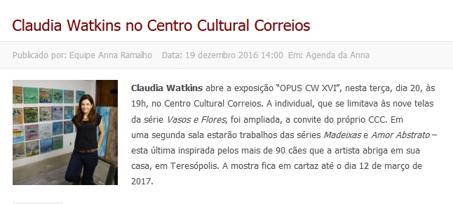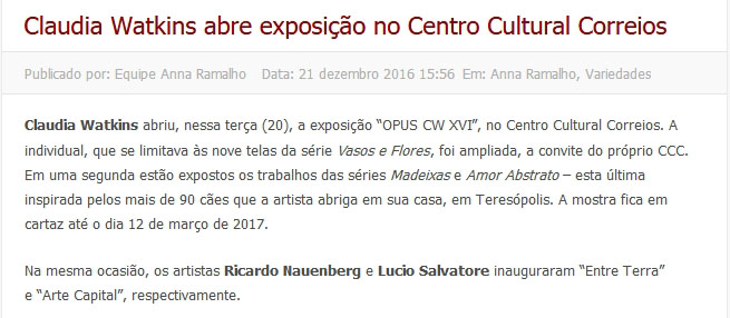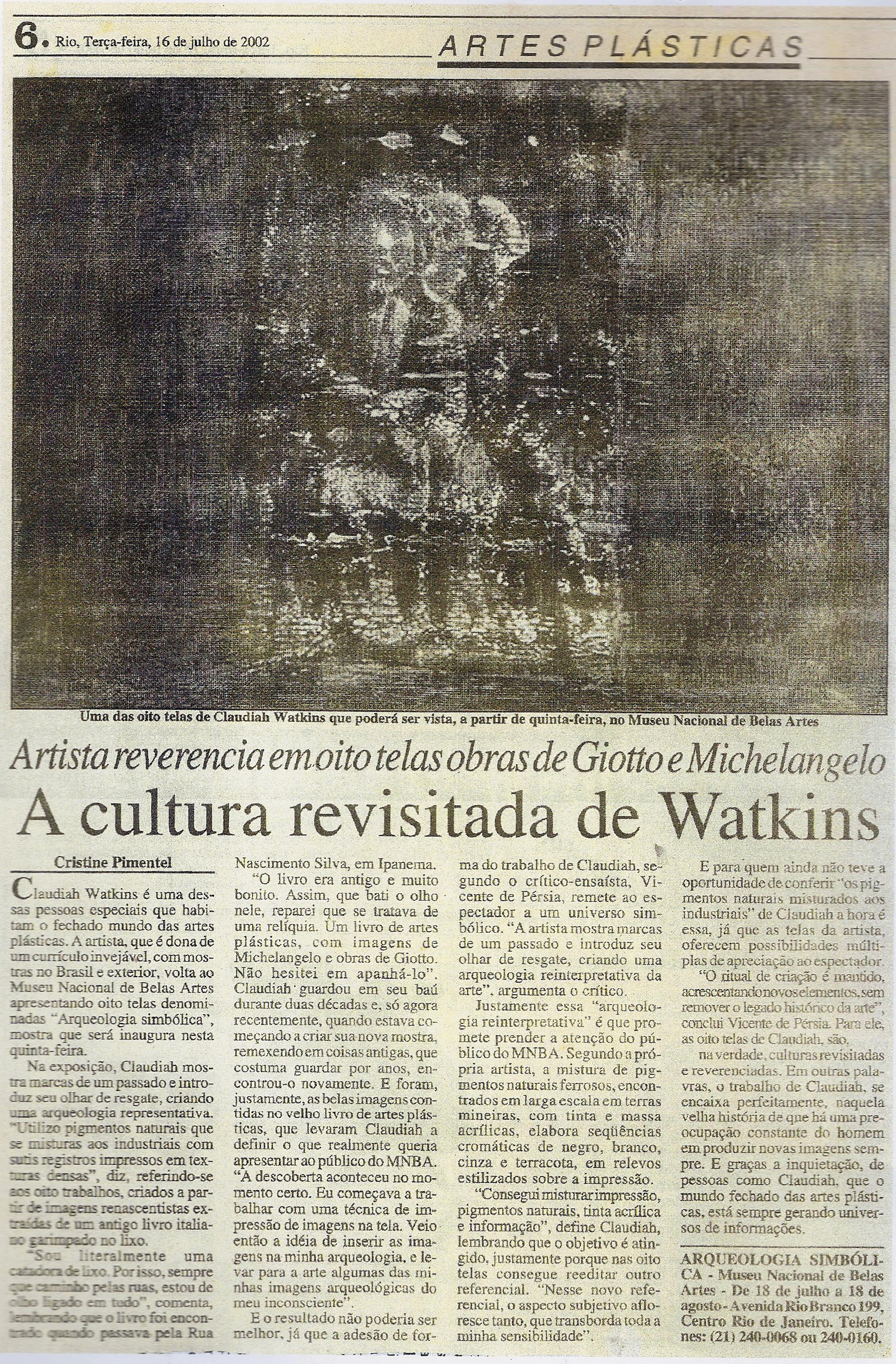 Claudia Watkins tem a sofisticação técnica e intelectual do Séc. XX, mas ao criar procura despojar-se dos paradigmas de sua época e reencontrar-se com uma ancestralidade perdida.
