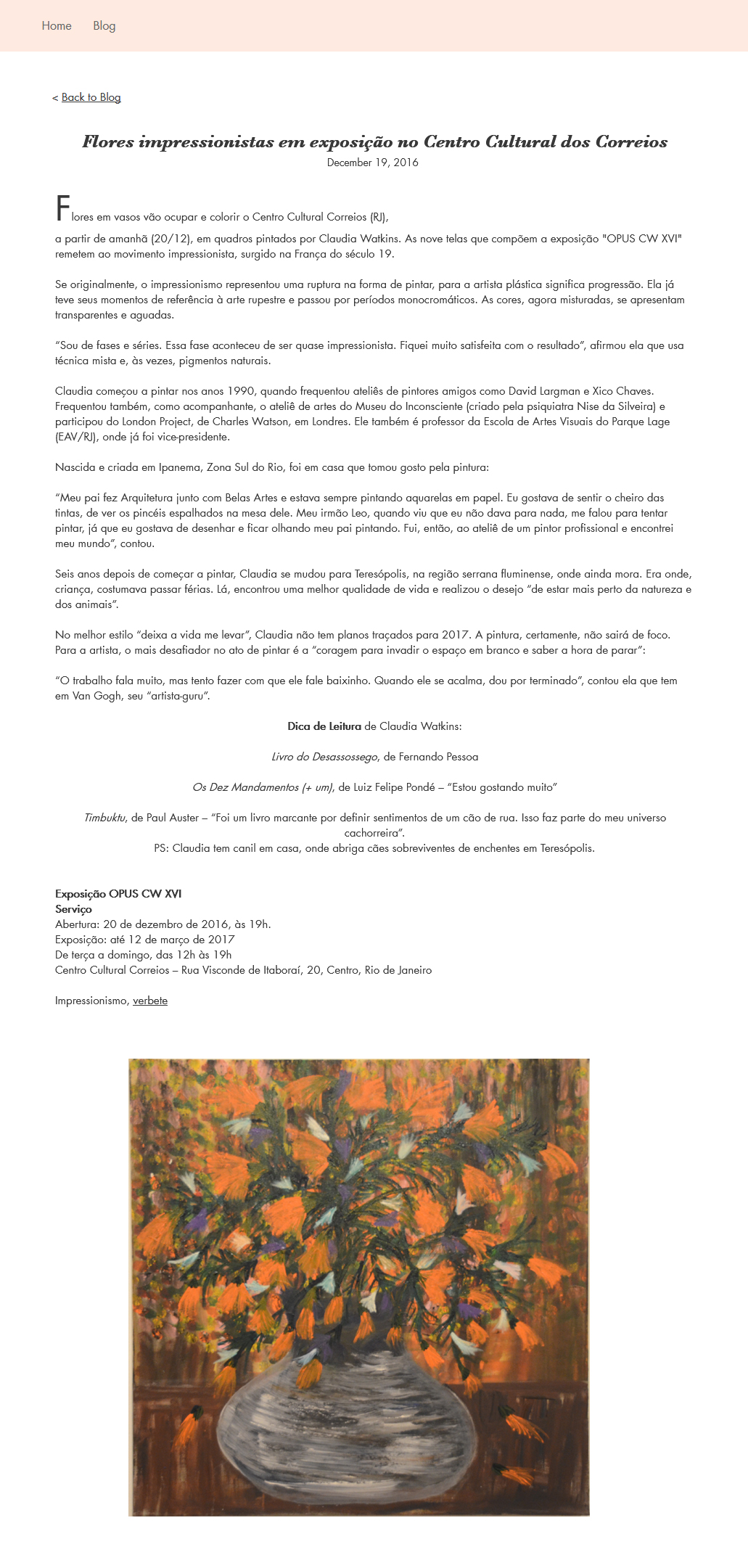 Nesta exposição literalmente aflora a materialização da imagem objetiva e central onde a abstração cede seu espaço à figuração, mas esta inversão não exaure sua presença intensa e afirmativa. O lirismo impressionista se configura como se a poesia estabelecesse um laço romântico entre o passado e o presente, a permanência da linguagem já consagrada e sua atualidade efêmera. Vasos de flores, pura e simplesmente, mas estas flores parecem imaginárias sem abdicarem de sua presença cotidiana. Predominam na pintura os relevos da espátula, ferramenta que a artista sempre manuseou com destreza e a planura expressiva da tinta, que imprime profundidade e luminosidade. A linha do horizonte, eventualmente presente em algumas de suas paisagens, torna-se concreta e instaura o plano de apoio para a explosão de cores sobre o fundo semi- infinito, com ranhuras e diversas camadas de cor, como paredes envelhecidas, o passado, que se reflete ainda sobre a mesa. No presente, flor e fundo se interpenetram de forma compacta ou translúcida, com suas constelações florais intensas, híbridas, inquietas, sonoras, sensitivas, vivas.
